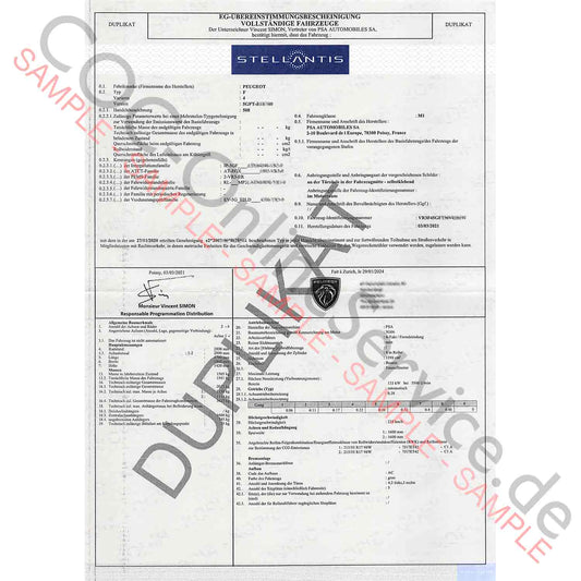 COC-asiakirjat Peugeotille (Certificate of Conformity)