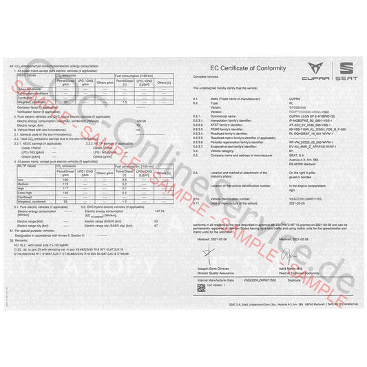 COC-dokumenter til SEAT (Certificate of Conformity)