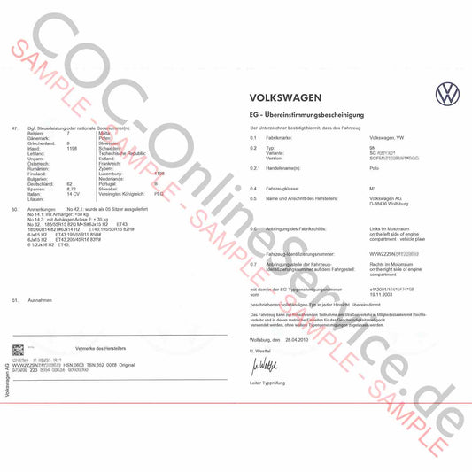 COC-asiakirjat VW Volkswagenille (Certificate of Conformity)